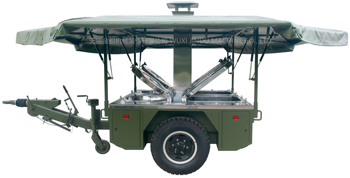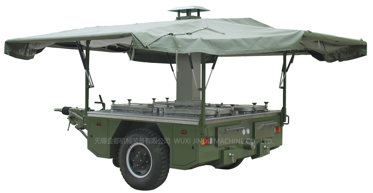 The cooking trailer adopts a single axle double wheel trailer chassis, which can be towed or loaded by transport vehicles. It mainly consists of cooking equipment, burners, tents, and supporting equipment, divided into flat type and plateau type, both suitable for processing hot food under field conditions.
