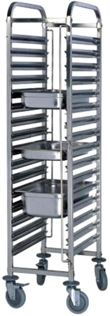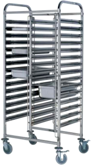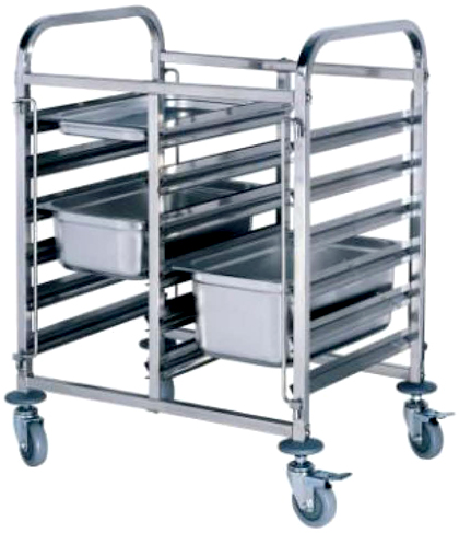 The SS GN Tray Trolley is almost suitable for all hotels, restaurants, central kitchens and other catering venues, which can efficiently organize trays and improve space utilization.Through its vertical multi-layer design, it can neatly store a large number of trays (such as 600 × 400mm baking pans or GN pans), and flexibly transport them between the work area and storage area, saving kitchen space and maintaining food hygiene. In terms of specifications, it supports users to customize sizes, layers, and materials according to their needs, all with lock design and detachable.
