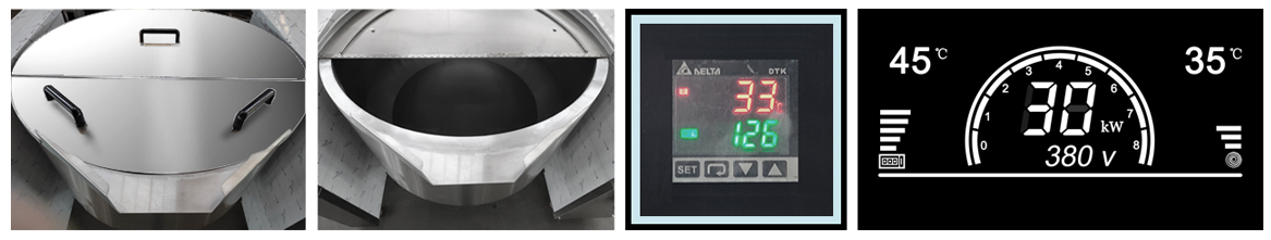 △ 电磁加热,热效率高 △ 清洁无明火,无燃料污染 △ 防干烧、过热及电流/电压异常等保护 △ 可倾式大容量锅体 △ 支持锅体容积、加热功率定制 | △ Induction heating, high thermal efficiency △ No flame, no risk of fire hazards or pollution from fuel △ Protections:Dry burning, overheating, abnormal current/voltage, etc. △ Tilting-type large capacity cauldron △ Support customization: cauldron volume, heating power |